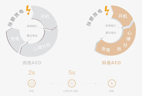當(dāng)患者出現(xiàn)心臟驟停時(shí),黃金搶救時(shí)間只有4分鐘,分秒必爭(zhēng)。科曼AED在心律分析過(guò)程中同步智能預(yù)充電縮短了開(kāi)機(jī)和心律分析的時(shí)間,開(kāi)機(jī)到充電完成全程不超過(guò)7秒,心律分析完成時(shí)即刻可以進(jìn)行放電。
